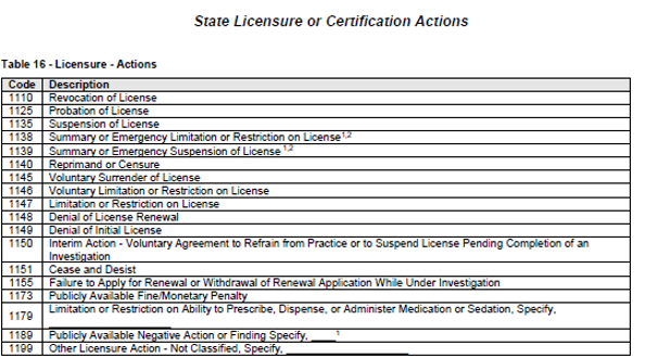 But if you look at codes in the National Practitioner Data Bank (NPDB), here’s a short list of those that can be submitted by a state licensing body.